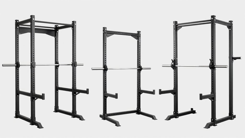 A power rack offers the most safety, stability, and exercise versatility, ideal for heavy lifts and serious training. Squat stands are compact, budget-friendly, and great if you have limited space or are just starting out. Half racks strike a balance, providing good safety features and flexibility without taking up as much room. To find out which type suits your goals, space, and budget, keep going to learn more about each option.