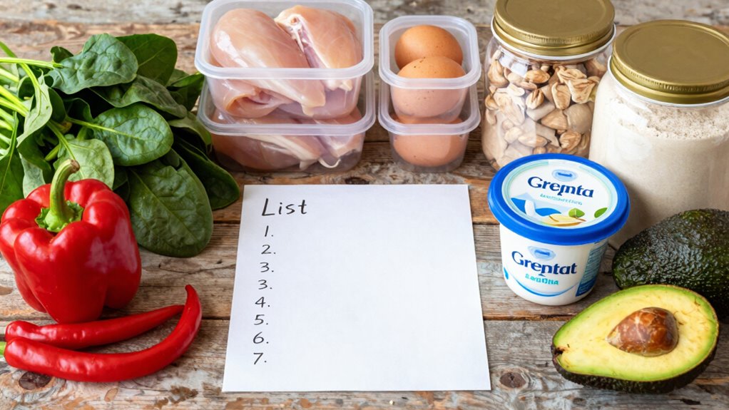 Create a grocery list focused on high-protein foods like eggs, Greek yogurt, lean meats, seafood, and protein powders. Add complex carbs such as oats, brown rice, and sweet potatoes, along with healthy fats from nuts, seeds, and avocados. Keep snacks like jerky and protein bars handy for extra hits of protein. Planning ahead and stocking these essentials makes building meals that hit your protein targets simple and consistent. Keep going to discover more easy meal strategies.