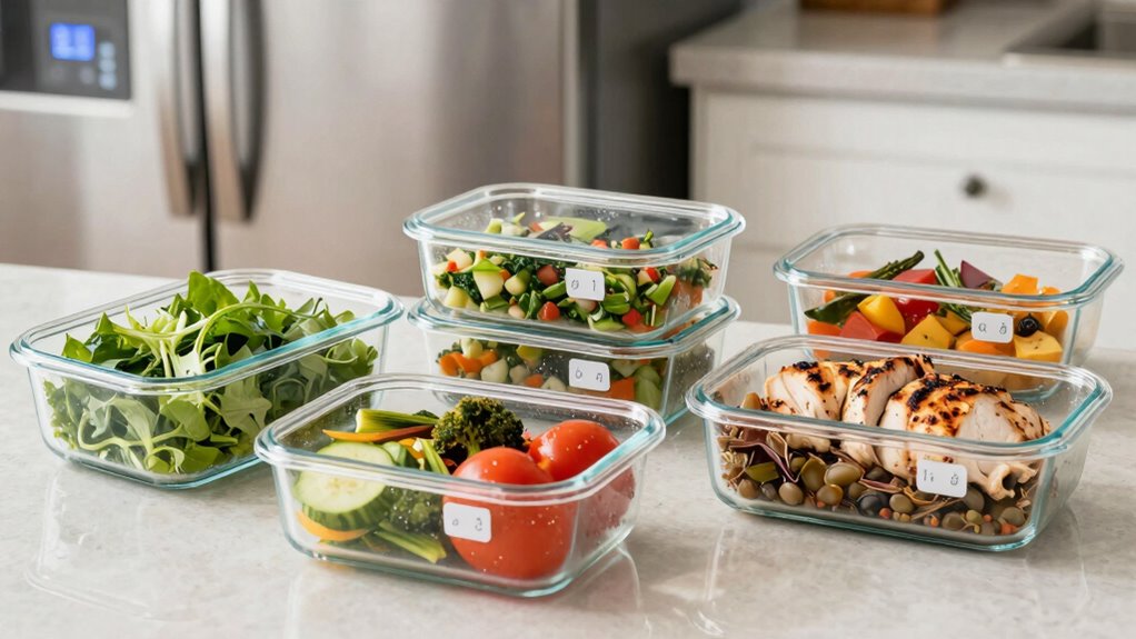 Meal prepping is a great way to save time and stay healthy, but guaranteeing your food stays safe is essential. Proper storage techniques help prevent foodborne illnesses and maintain the quality of your prepared meals. One of the key aspects of food safety is understanding how long your meals remain safe to eat and the best methods to store them. Freezing techniques play a crucial role in prolonging the shelf life of your meals. When you freeze food properly, you lock in freshness and prevent the growth of harmful bacteria. To do this effectively, use airtight containers or freezer bags designed for long-term storage. Remove as much air as possible before sealing to prevent freezer burn and maintain texture and flavor. Label each package with the date you prepared it so you can keep track of how long it’s been stored. Keep your freezer at 0°F (-18°C) or below to guarantee optimal preservation.