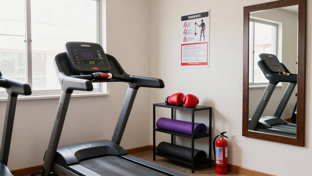 Once you’ve cleared your workout space of hazards, it’s time to focus on selecting and setting up your equipment safely. Choose equipment that matches your fitness level and space constraints. Always inspect new or used gear for signs of damage, and perform regular equipment maintenance to guarantee safety. Proper space organization helps prevent accidents; keep equipment arranged to allow easy movement and avoid clutter. When setting up, secure items like weights or unstable machinery to prevent tipping. Follow the manufacturer’s instructions closely for assembly and use. Use mats or padding where needed to provide stability and protect your floors. Regularly check your equipment for wear and tear, replacing or repairing as necessary. Proper equipment setup and maintenance reduce risks and keep your workouts safe.