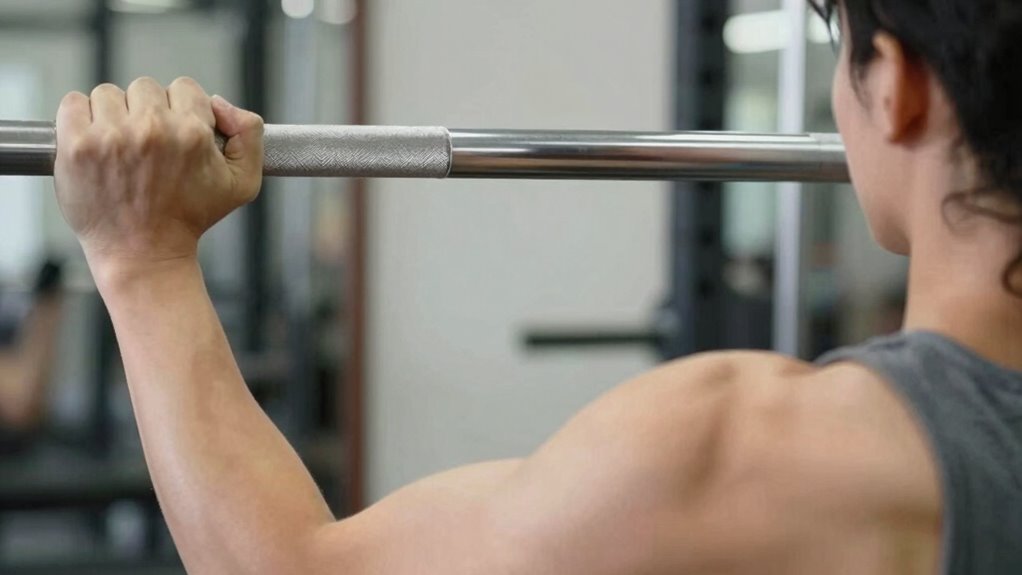The Swiss Bar Press is a variation of the traditional bench press that features a unique, multi-grip design, allowing you to target different muscle groups and reduce strain on your shoulders. With adjustable grip width, you can customize the exercise to suit your comfort and goals. Changing your grip affects muscle engagement, activating different parts of your chest, shoulders, and triceps. A narrower grip emphasizes your triceps and inner chest, while a wider grip targets your outer chest and shoulders. This versatility helps you avoid overusing certain muscles and decreases the risk of shoulder stress. By switching grip positions, you can maintain effective muscle engagement while protecting your shoulder joints, making the Swiss Bar Press a smart choice for safer, more balanced training. Incorporating proper equipment setup is also crucial for maximizing safety and effectiveness during your workout. Additionally, understanding the anatomy of shoulder muscles can help you execute the exercise with proper form, further reducing the risk of injury. Incorporating muscle activation techniques can also optimize your workout results and ensure balanced development. Using training variations can help prevent plateaus and promote continuous progress. A thorough understanding of muscle engagement can guide you in selecting the most effective grip positions for your specific goals.