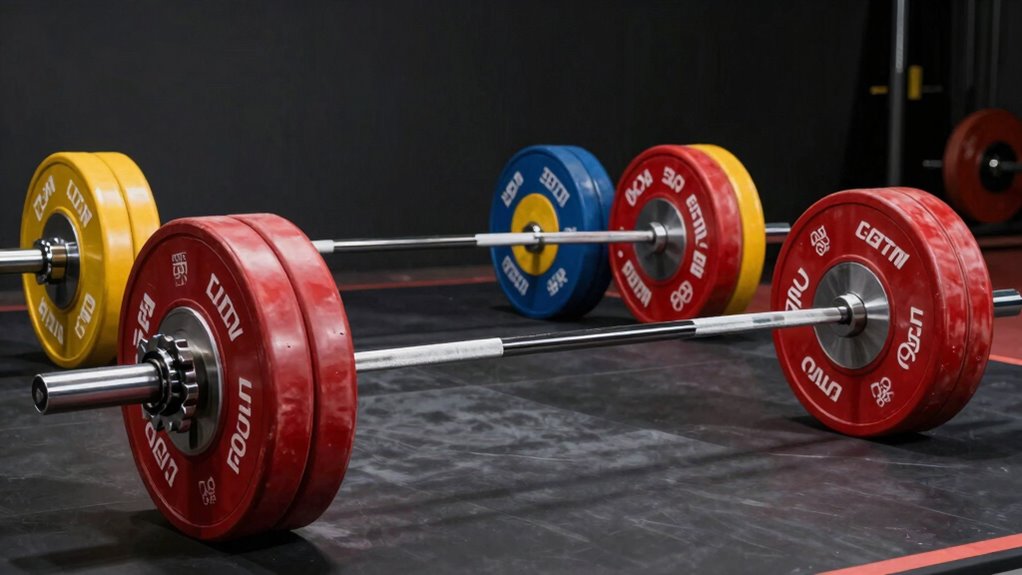 When selecting a 15kg women’s Olympic barbell, verifying proper size and compatibility is essential for safe and effective lifting. The shaft diameter should be around 25mm, which is standard for women’s barbells, providing a comfortable grip. The overall length typically ranges from 79 to 79.5 inches, making it compatible with standard Olympic weight plates that have a 2-inch hole. It’s important to check the loadable sleeve length, usually between 11 and 13 inches, to confirm it can hold enough plates for your training. Additionally, the barbell should meet IWF competition standards if you plan to compete or train seriously. Finally, consider the tensile strength, often around 190,000 PSI, to guarantee durability during heavy lifts.