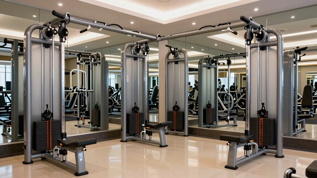 Choosing an adjustable cable resistance machine requires verifying it can support a variety of accessories to maximize workout options. I look for machines that come with a thorough attachment kit, allowing me to target different muscle groups effectively. Compatibility with standard weight plates is also essential, as it offers flexible resistance adjustments using commonly available equipment. I prefer machines that support multiple cable attachment options, which boost versatility for various exercises. Dual cable attachment brackets are a plus, enabling quick switching between resistance ratios for different intensities. Additionally, I check if the construction supports accessories like lat pulldown bars, tricep ropes, and handles. This compatibility verifies I can customize my workouts and get the most out of my investment.