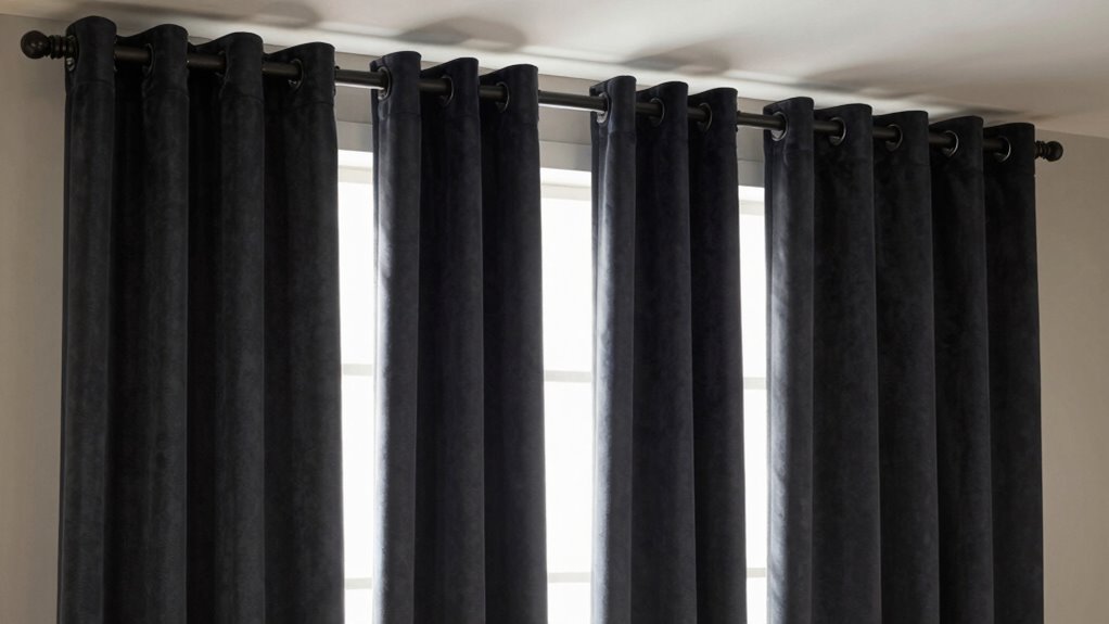 Blackout curtains are versatile, fitting most window types like a glove, but they’re not one-size-fits-all. Think of them as a chameleon, adapting to your space. They work well on standard, sliding, and even arched windows, but you might need custom sizes or special mounting options for irregular shapes. I recommend measuring carefully and checking the curtain’s specifications to guarantee a snug fit that blocks out light effectively.
