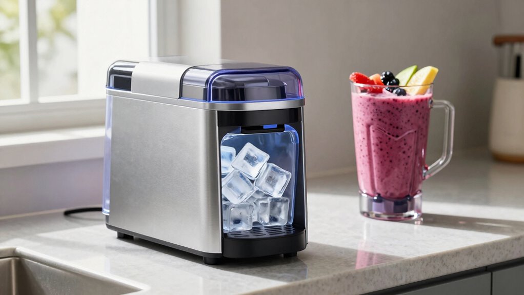 Choosing a countertop ice maker that operates quietly can greatly improve my smoothie-making experience, especially when blending high-protein drinks in the same space. Many models run around 45 dB, which is quiet enough for kitchens, offices, or apartments without causing disruption. Ice makers producing less than 45 dB are considered quiet, allowing me to focus on blending without noise interference. Higher noise levels can be distracting, especially when I’m close to the machine. It’s important to check the noise level ratings provided by manufacturers, as some models advertise low-noise operation for user convenience. A quieter ice maker helps create a peaceful environment, making the entire smoothie preparation process more enjoyable and less stressful. This way, I can concentrate on my high-protein recipes without unnecessary background noise.