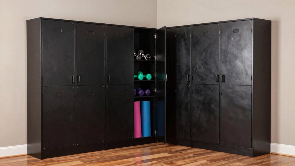 Material durability is just one aspect of selecting a heavy-duty home gym storage cabinet. Security features are essential for protecting your valuables and sensitive items. I always look for cabinets with lockable doors and high-grade locks to deter unauthorized access. A three-point locking system is even better, as it provides multiple closure points for added security. Magnetic door closures are another feature I appreciate; they guarantee doors close securely and stay shut during workouts. If you’re concerned about stability, consider wall-mountable cabinets to prevent tipping in high-traffic areas. Finally, cabinets with anti-collision reinforcements help minimize wear on locks, assuring they operate smoothly over time. Prioritizing these security features gives me peace of mind.