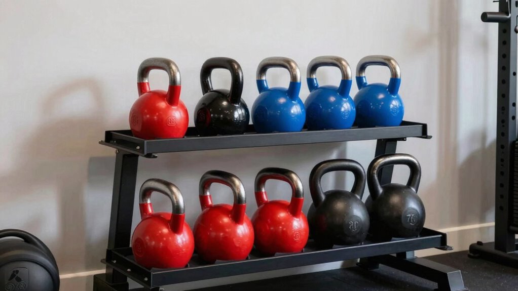 Organized storage options for kettlebells can greatly improve your workout space by keeping weights easily accessible and reducing clutter. A stand or rack specifically designed for kettlebells makes it simple to find the right weight quickly, saving you time during routines. The flat bottom design of the kettlebells guarantees stability when placed on the stand, preventing tipping and enhancing safety. Proper storage also protects the kettlebells from scratches and damage, helping them last longer and stay looking new. Investing in an effective organization system means less frustration and more focus on your workout. Whether you choose a standalone rack or a wall-mounted stand, a dedicated storage solution keeps your space tidy and maximizes efficiency, making your fitness routine smoother and more enjoyable.
