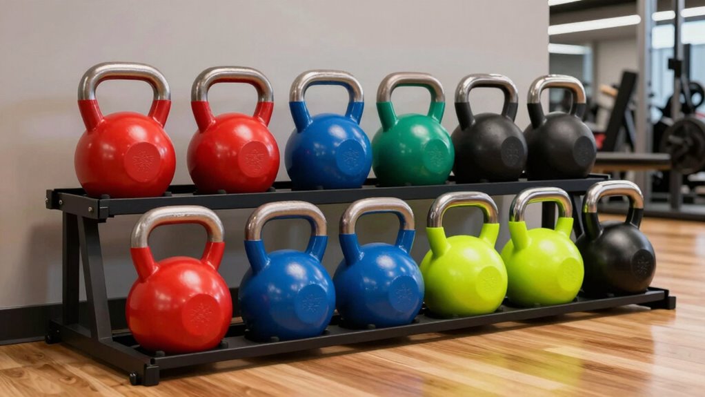 Choosing a kettlebell set with a rack means paying close attention to the materials used, as they directly impact durability and performance. High-quality materials like cast iron, cement, or high-density polyethylene guarantee the weights resist rust and stand up to frequent use. A neoprene coating adds protection for flooring and reduces noise, making workouts more comfortable and extending the lifespan of the kettlebells. Look for kettlebells with ergonomic designs, including wide handles that provide a secure grip, which is essential for safety. Heavy-duty construction guarantees the equipment can handle repeated use without degrading. Additionally, the storage rack should be made from durable materials, supporting organization and preventing damage to the weights. Prioritizing quality materials guarantees your investment lasts for years of effective training.