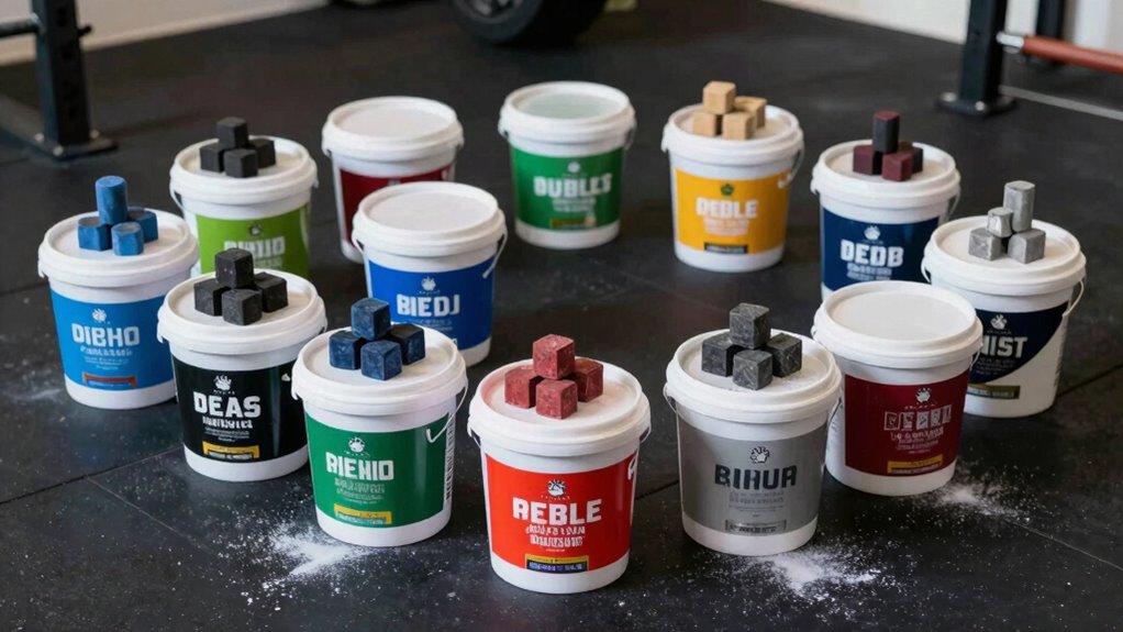 Understanding chalk composition quality sets the stage for evaluating moisture absorption efficiency. When I’m choosing a lifting chalk block bucket, I always look for high-quality products made from 100% pure magnesium carbonate. These chalk blocks effectively absorb moisture from my hands, ensuring a dry grip during intense workouts. It’s essential, especially when sweat can compromise my performance. I appreciate that fine-textured chalk powders enhance moisture absorption, allowing for quick, effective application. Plus, the right formulation minimizes the need for constant reapplication, keeping my hands dry longer. By prioritizing chalk with strong moisture absorption properties, I can greatly boost my grip control in weightlifting, gymnastics, and rock climbing, helping me perform at my best.