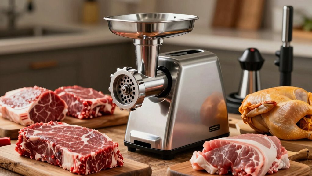 After confirming you’ve selected a powerful motor for your heavy-duty electric meat grinder, the next factor to contemplate is grinding speed and efficiency. Typically, these grinders can process anywhere from 2 to 5 pounds of meat per minute for home use, while commercial models can tackle up to 550 pounds per hour. The motor’s wattage is vital; higher wattage, often between 300W to over 3500W, usually means better performance. A well-designed grinder with a wide feeding tube and sharp blades can minimize pre-cutting, enhancing efficiency. Additionally, having multiple grinding plates allows you to customize the grind size for various recipes. Don’t overlook features like auto-reverse functions, which prevent jams and guarantee smooth, consistent operation.