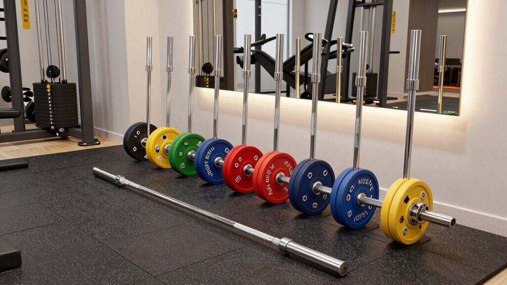 I’d recommend a barbell around 6 to 7 feet long for a limited home gym space. This size offers enough length for safe lifts without overcrowding your area. Shorter bars, like 5 feet, are great for compact spaces and easier storage, but they might limit your lifting options. I find that a 6 to 7-foot bar strikes a good balance between usability and space efficiency, making your workouts safer and more versatile.