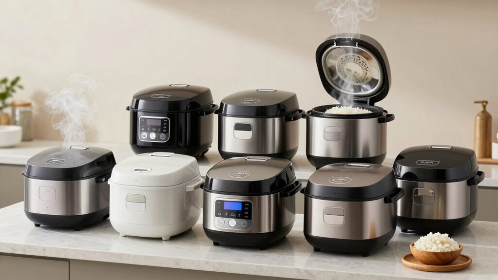 Choosing the right cooking capacity for a premium fuzzy logic rice cooker is essential, especially since it can considerably impact your meal preparation and dining experience. When I look for a rice cooker, I consider the uncooked rice capacity, which typically ranges from 3 to 10 cups. A smaller model (3 to 5.5 cups) is perfect for singles or couples, while larger options (6 to 10 cups) cater to families or gatherings. Remember, one cup of uncooked rice usually serves 2 to 3 people, so I base my choice on how many servings I typically need. If I plan to cook various grains or meals, a larger capacity offers versatility, making it easier to accommodate diverse dietary needs.