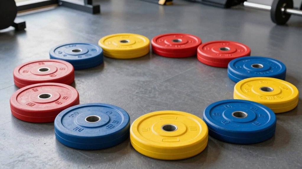 If you’re serious about protecting your floors and ensuring durability during intense workouts, a rubber coated weight plates set is an ideal choice. These sets feature a solid cast iron core with reinforced rubber coating, which withstands rigorous use and shields your flooring. Steel-reinforced collars guarantee a perfect fit on all Olympic-standard barbells. The triple grip holes make handling safe and easy during lifts like deadlifts and squats. Available in a range of colors and weights, they’re compatible with most gym equipment without adapters. Whether you’re a beginner or pro, these versatile, floor-friendly plates are perfect for a variety of training routines.