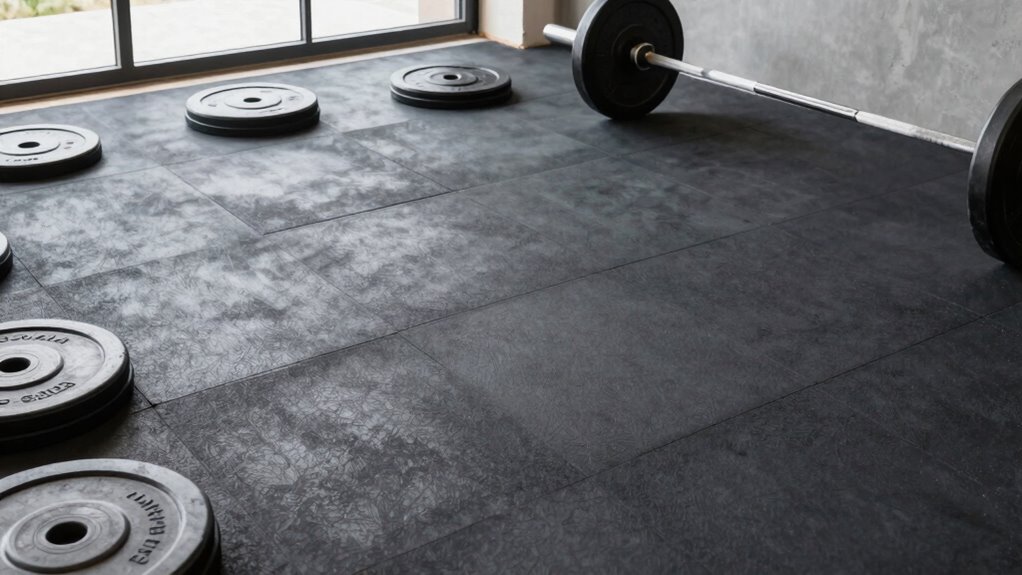 Choosing rubber flooring that can withstand the impact of dropping weights is essential for durability and safety. A thickness of at least 0.75 inches helps absorb shocks and prevents damage over time. High-density rubber compounds provide superior impact resistance, allowing the flooring to handle repeated heavy drops without cracking or tearing. The material’s ability to resist compression from dropped weights ensures long-lasting performance and maintains its protective qualities. Many impact-resistant options feature reinforced layers or specialized formulations designed specifically for heavy impacts. Proper impact resistance also minimizes vibrations and noise, which reduces stress on the structure and creates a safer workout environment. Investing in durable, impact-resistant rubber flooring means fewer replacements and a more reliable surface for your weightlifting needs.