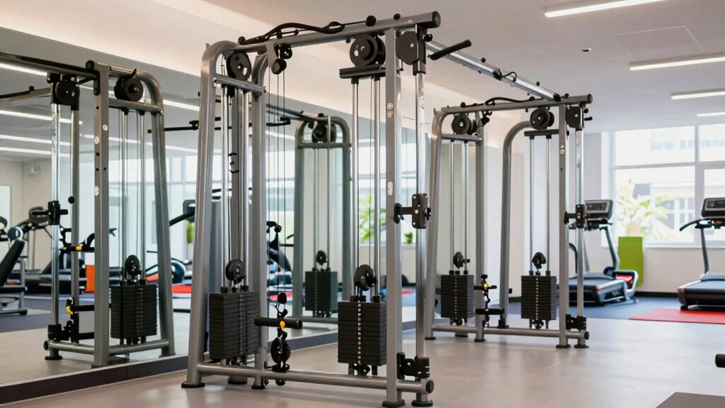 A Smith machine with a cable system greatly boosts workout versatility by enabling a wide variety of exercises that target multiple muscle groups. With options like squats, bench presses, lat pulldowns, rows, tricep extensions, and bicep curls, you can effectively work your entire body. Many models feature dual pulley systems that allow independent arm movements, making exercises like cable crossovers and unilateral training possible. Adjustable height settings on the cables guarantee you can customize workouts for different users and fitness levels. Some machines even include functional training features like pull-up bars or dip stations, providing a full-body workout in one station. Plus, with multiple attachments such as tricep ropes and ankle straps, you can further personalize your routines for all-encompassing training.