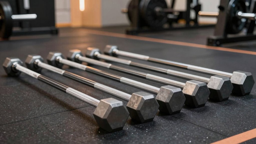 Considering the space you have available is key when selecting a trap bar hex bar for deadlifts. Some models are compact, making them perfect for limited home gym areas. Lighter bars are easier to store under furniture or in small closets, which is a big plus if space is tight. The design also matters—shaped to be more streamlined, these bars are easier to transport and store. Protective packaging can help keep your trap bar in good condition during transit and storage, prolonging its lifespan. Additionally, look for models that allow quick loading and unloading of weights, which can simplify storage management. Overall, choosing a bar that fits your space and storage needs guarantees convenient access and helps keep your workout area organized.