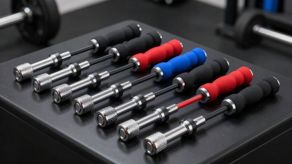 Ensuring grip comfort and safety is essential because it directly impacts both your performance and injury risk during workouts. Ergonomic rubber grips with textured surfaces improve comfort and help prevent slipping when you’re pushing hard. Thick, padded handles reduce hand fatigue and give you a secure, non-slip grip, even during intense sets. Handles with wavy or knurled textures increase friction, boosting grip stability and safety. Properly cushioned grips also minimize pressure points, decreasing the chances of blisters and calluses. When you have a secure grip, you gain better control over your exercises, which reduces the risk of accidents or injuries. Prioritizing these features ensures your workout remains effective, safe, and comfortable, allowing you to focus on building strength without worry.